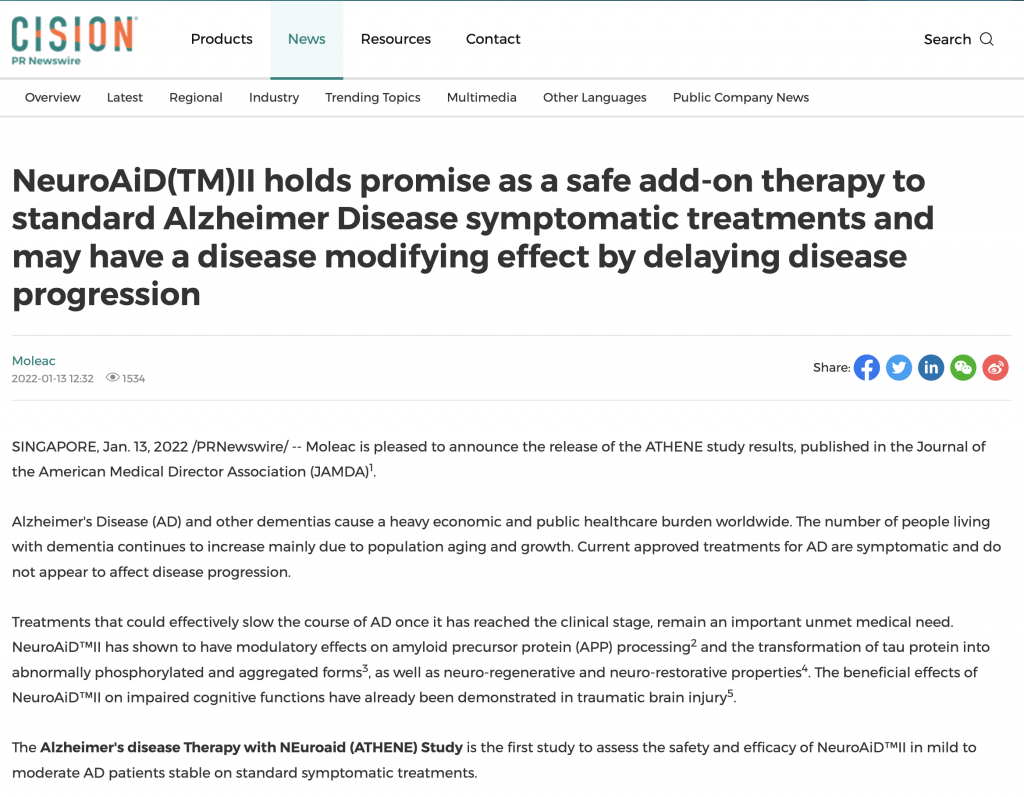 January, publication of the ATHENE study: NeuroAiD™II holds promise as a safe add-on therapy to standard Alzheimer Disease symptomatic treatments and may have a disease modifying effect by delaying disease progression.