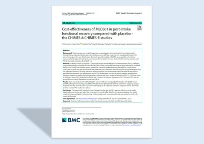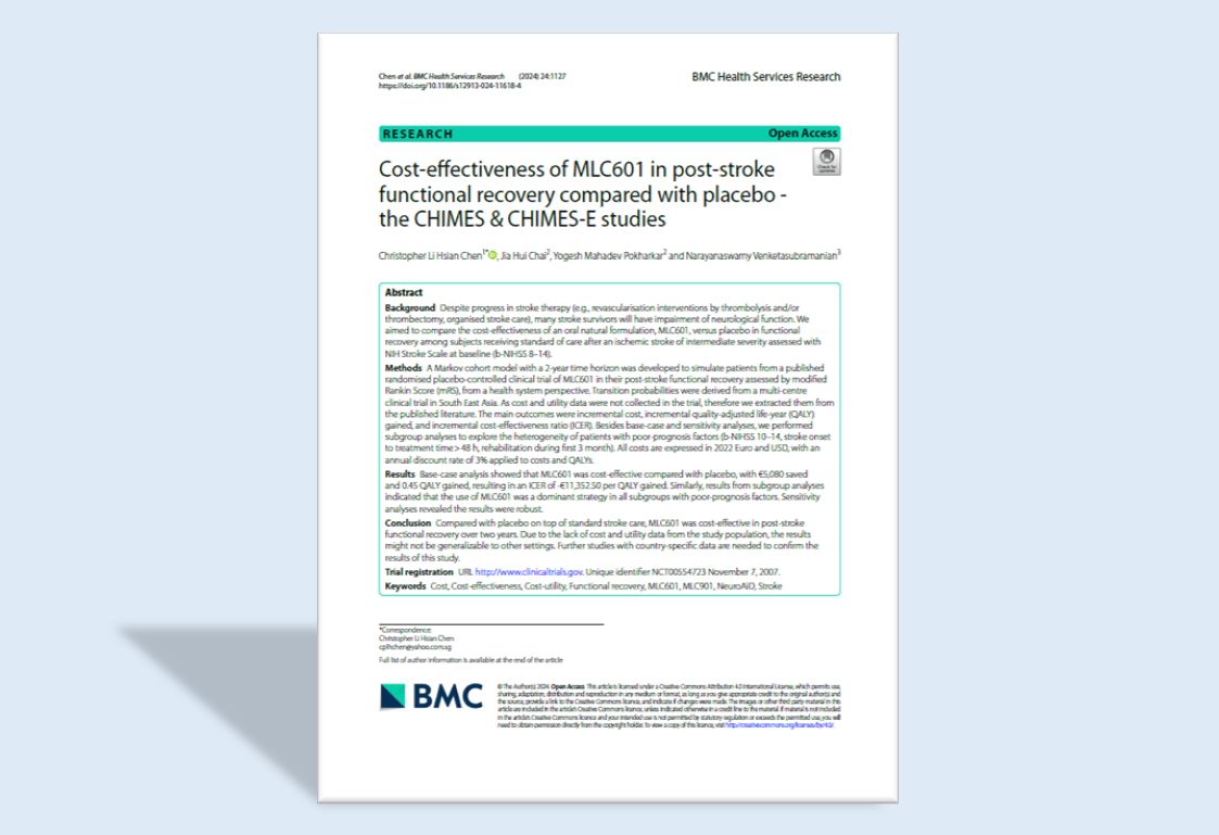 Read the full study on: https://bmchealthservres.biomedcentral.com/articles/10.1186/s12913-024-11618-4. Chen, C.L.H., Chai, J.H., Pokharkar, Y.M. et al. Cost-effectiveness of MLC601 in post-stroke functional recovery compared with placebo – the CHIMES & CHIMES-E studies. BMC Health Serv Res 24, 1127 (2024). This article is licensed under a CC-BY license.