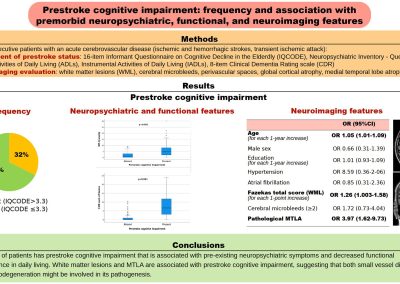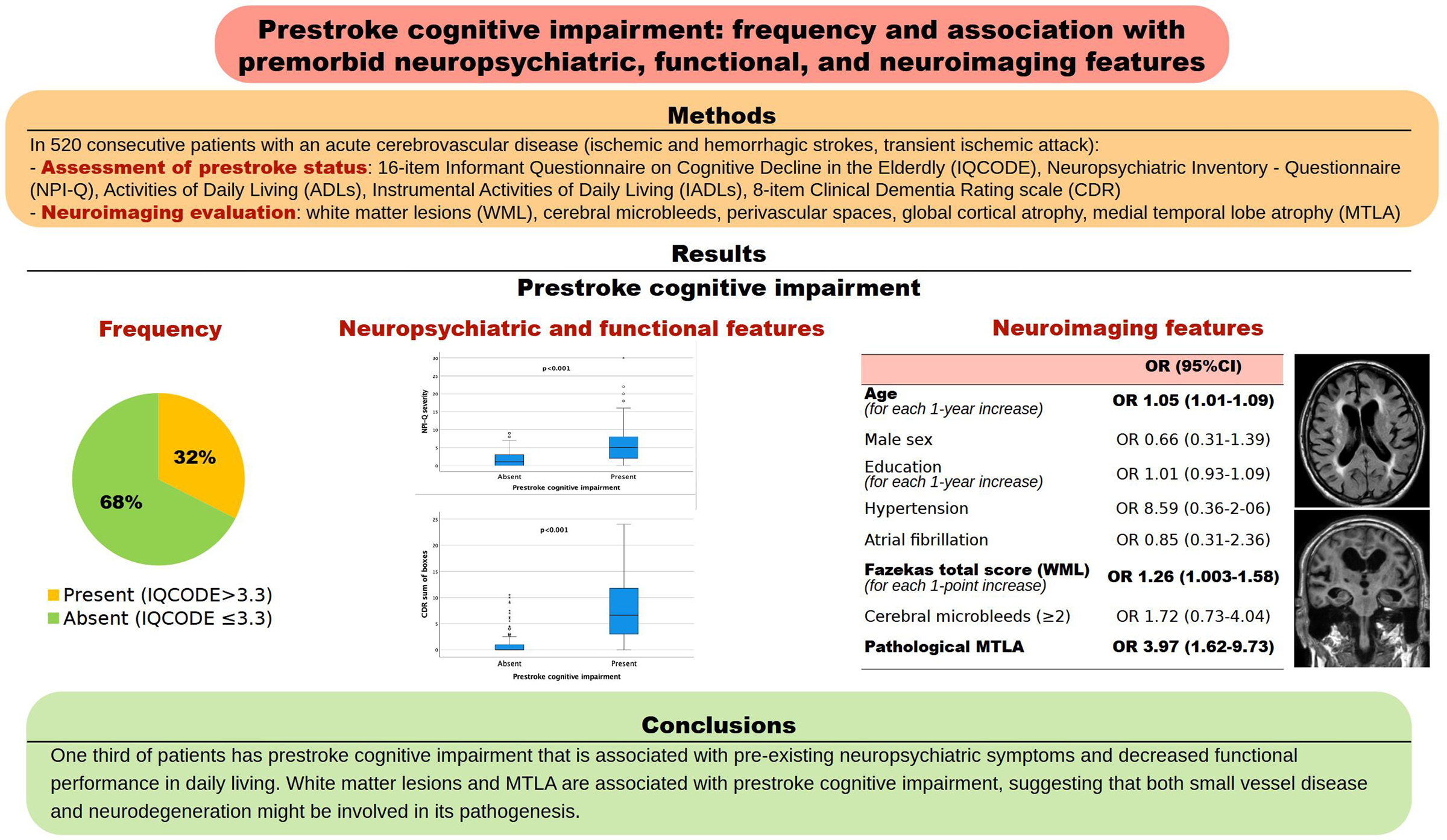 The study by Mele et al. investigates in 474 patients (45% women; mean age 75.5±13.3 years) the prevalence of prestroke cognitive impairment (pre-SCI), diagnosed with the IQCODE (Informant Questionnaire on Cognitive Decline in the Elderly), and its associations with premorbid neuropsychiatric symptoms, functional abilities, and neuroimaging features. Findings indicate that one-third of patients admitted to a stroke unit have pre-SCI that is associated with preexisting neuropsychiatric symptoms and functional performance in daily living. Neuroimaging biomarkers such as white matter lesions and medial temporal lobe atrophy are associated with pre-SCI, suggesting that both small vessel disease and neurodegeneration might be involved in its etiology.